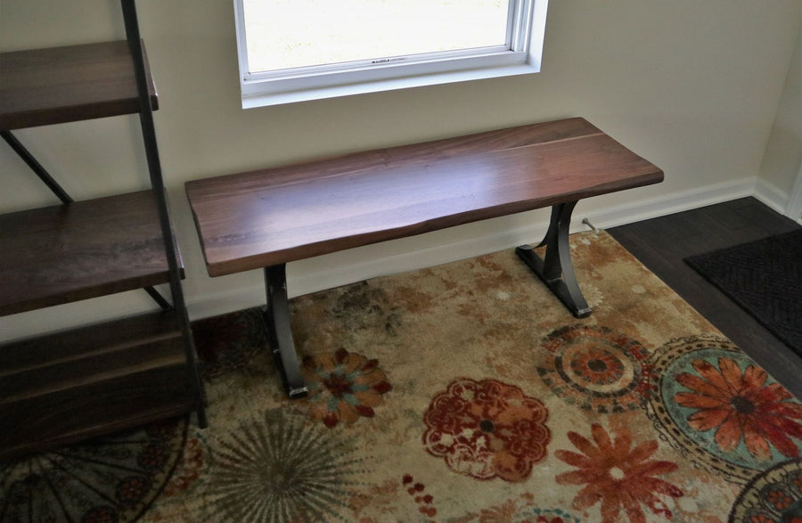 Metal Single Post Bench Walnut Thick Top No Cross Brace Minimal Distress No Grooves Natural Wavy Edge Light Brown Satin Satin Flatter Black Powder Coat