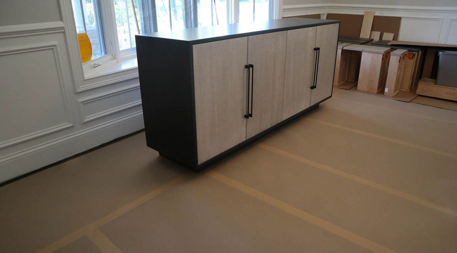 22x84x38 Custom Buffet Mitered Corners 1 Thick Box Front Panels Vertical Grain Platform Base Brown Maple Top Sides - Dark Knight QSWO Fronts - Mineral Flat