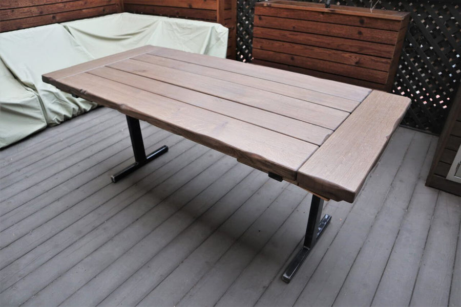 32x56 Metal T base 3x1.5 QSWO thicker 1.75ish minor gaps between planks 5 6 dist Behr Cordovan Brown Natural Steel fin 2 7 inch leaves 3 1280x853