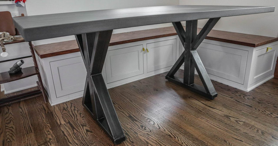 Elmhurst 44x86 Metal Connected X base 2x4 ash thick top no apron no cross brace clean edge no distress no grooves Black Espresso w white cerused flat Natural steel base 2 2