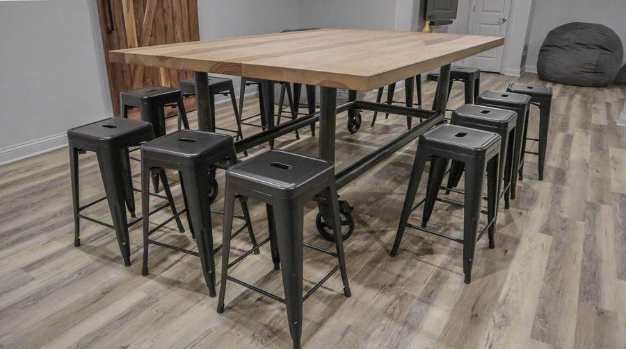 Mokena 60x96 custom metal base 8inch casters extra thick top ash clean edge light distress no grooves natural earth light flat natural steel grayish tone weld grind marks 1 1280x715