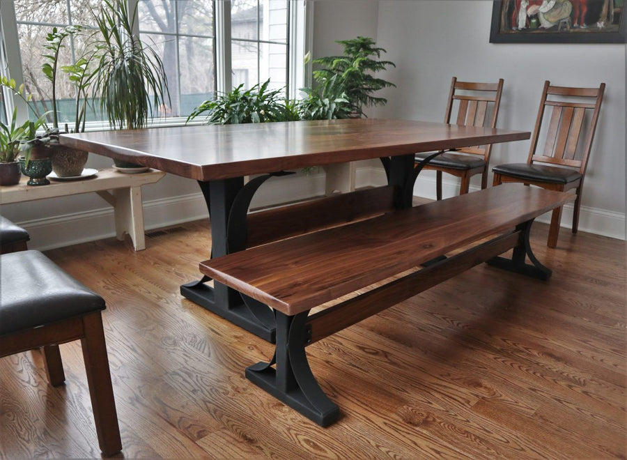 42x96x30 metal arched base wood cross brace thick top walnut 4 distress natural wavy edge no grooves bench to match 3 walnut jacoby chair 1280x992