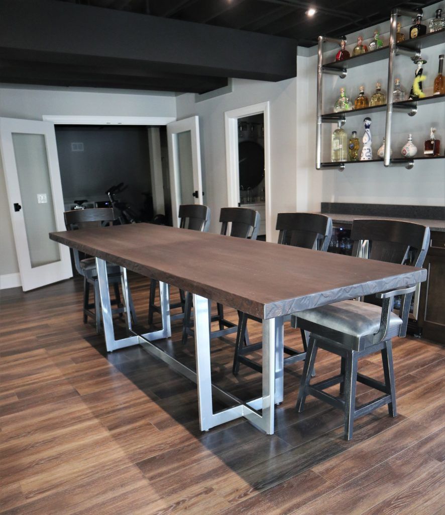Wilmington 30 40x108x42 walnut slab custom metal pipe base 3 natural flat top natural steel with wipe on clear REF metal stools 1 575x1024